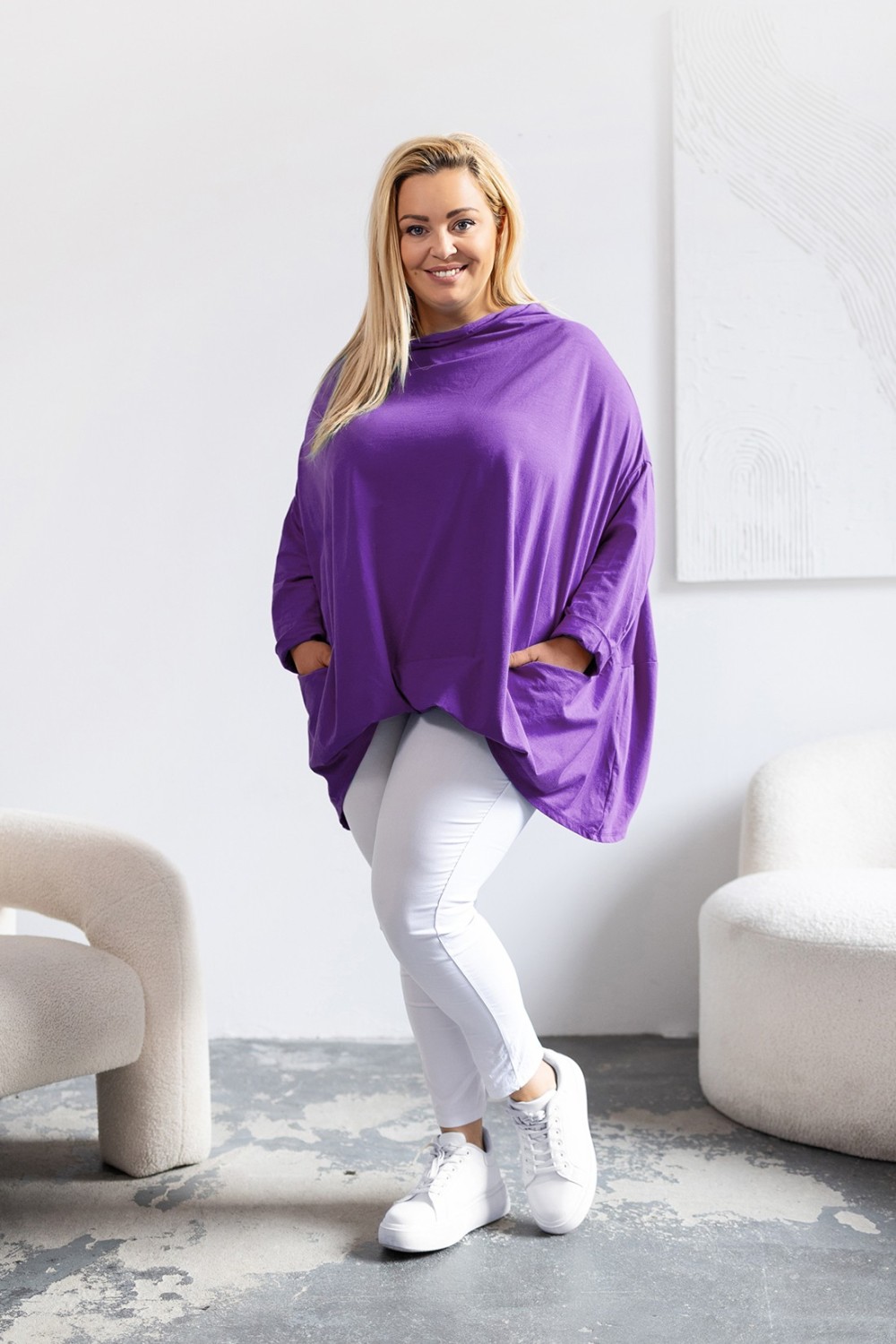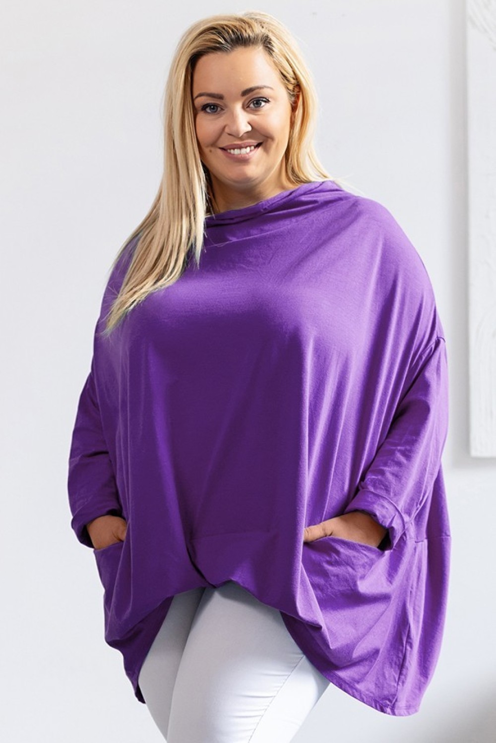 MEGA Oversize bluzka plus size w kolorze fioletowym z rękawem 3/4. Bluzka posiada kieszenie i dekolt wodę. Ten model o kroju nietoperza sprawi, że poczujesz komfort i wygodę. Tunikę wyróżnia l przyjemny materiał, świetnie wkomponuje się w codzienne oraz okazyjne stylizacje.