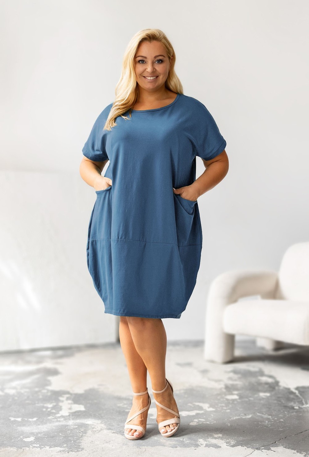 Bawełniana sukienka w kolorze denim o luźnym fasonie bombki. Sukienka posiada kieszenie na przodzie oraz ozdobne przeszycie z przodu oraz z tyłu. Sukienka MILEY sprawdzi się zarówno do sportowych, jak i bardziej casualowych stylizacji. Sukienka świetnie dopasowuje się do sylwetki, jest bardzo wygodna. Materiał z którego jest wykonana, jest elastyczny i świetny gatunkowo, a sama sukienka jest komfortowa w noszeniu i przyjemna w dotyku.