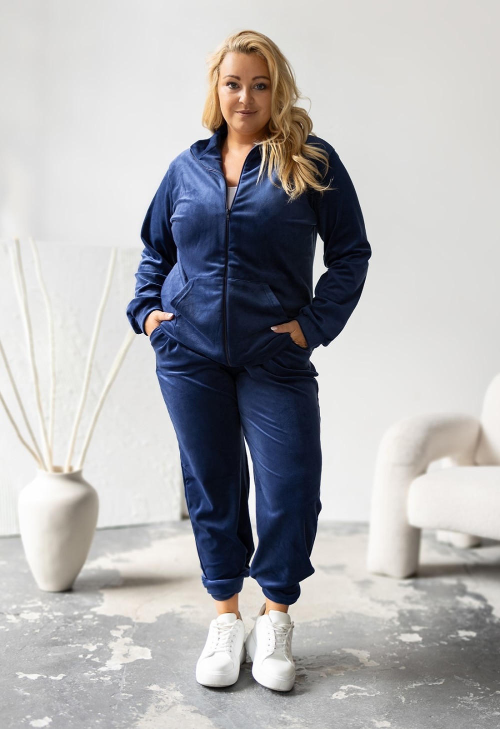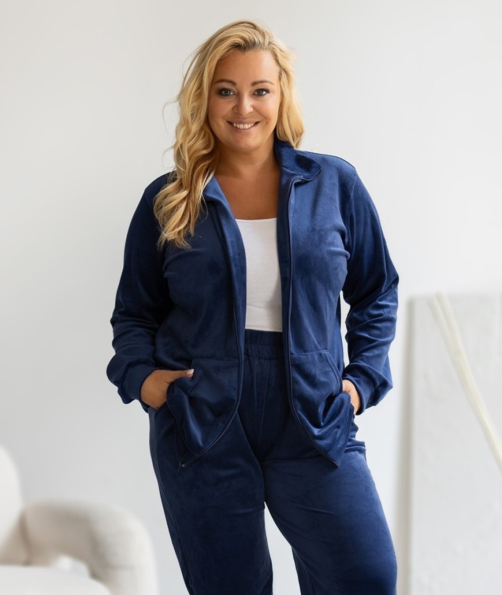 Welurowy dres damski plus size w kolorze granatowym komplet spodnie i bluza na zamek Bogna