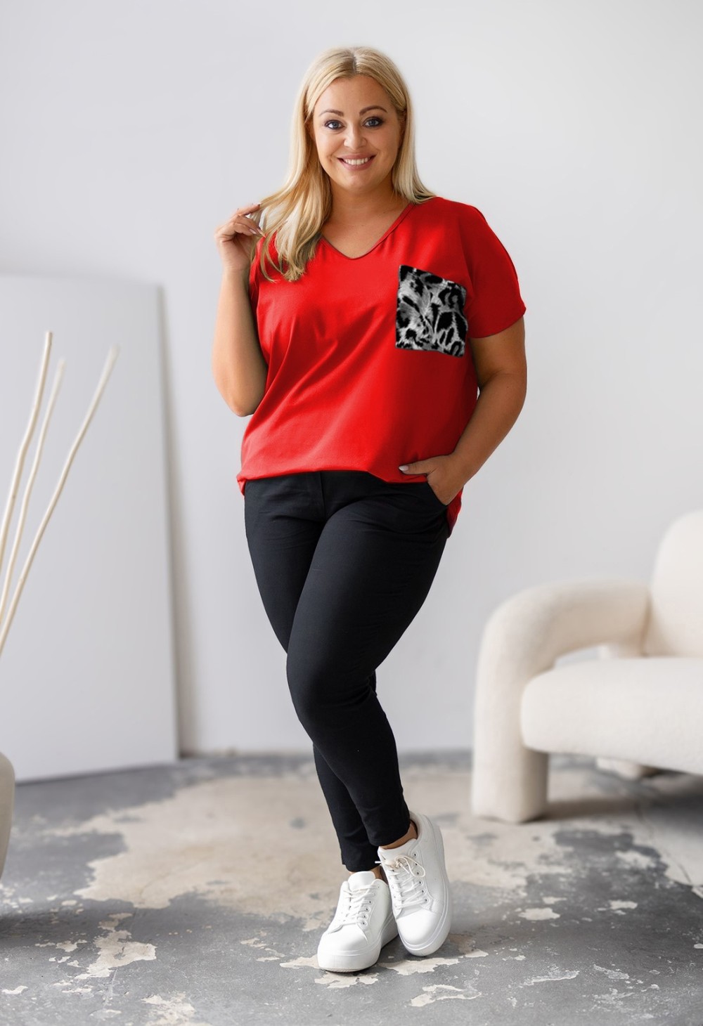 T-shirt damski plus size w kolorze czerwonym dekolt w serek V-neck szara panterka kieszeń PARRIS