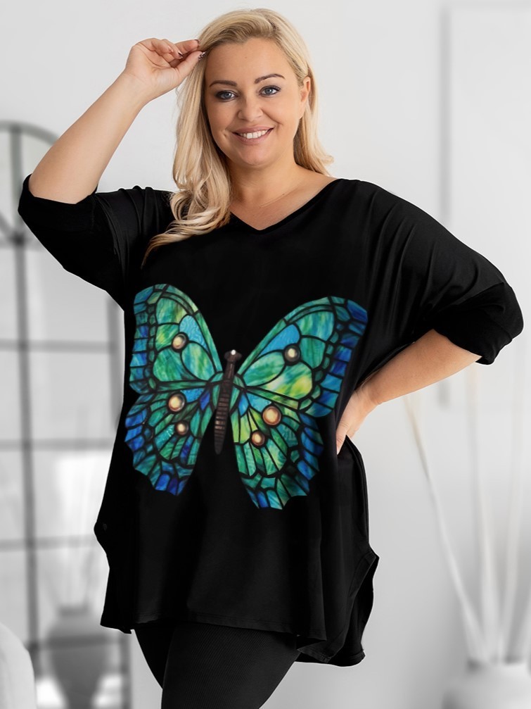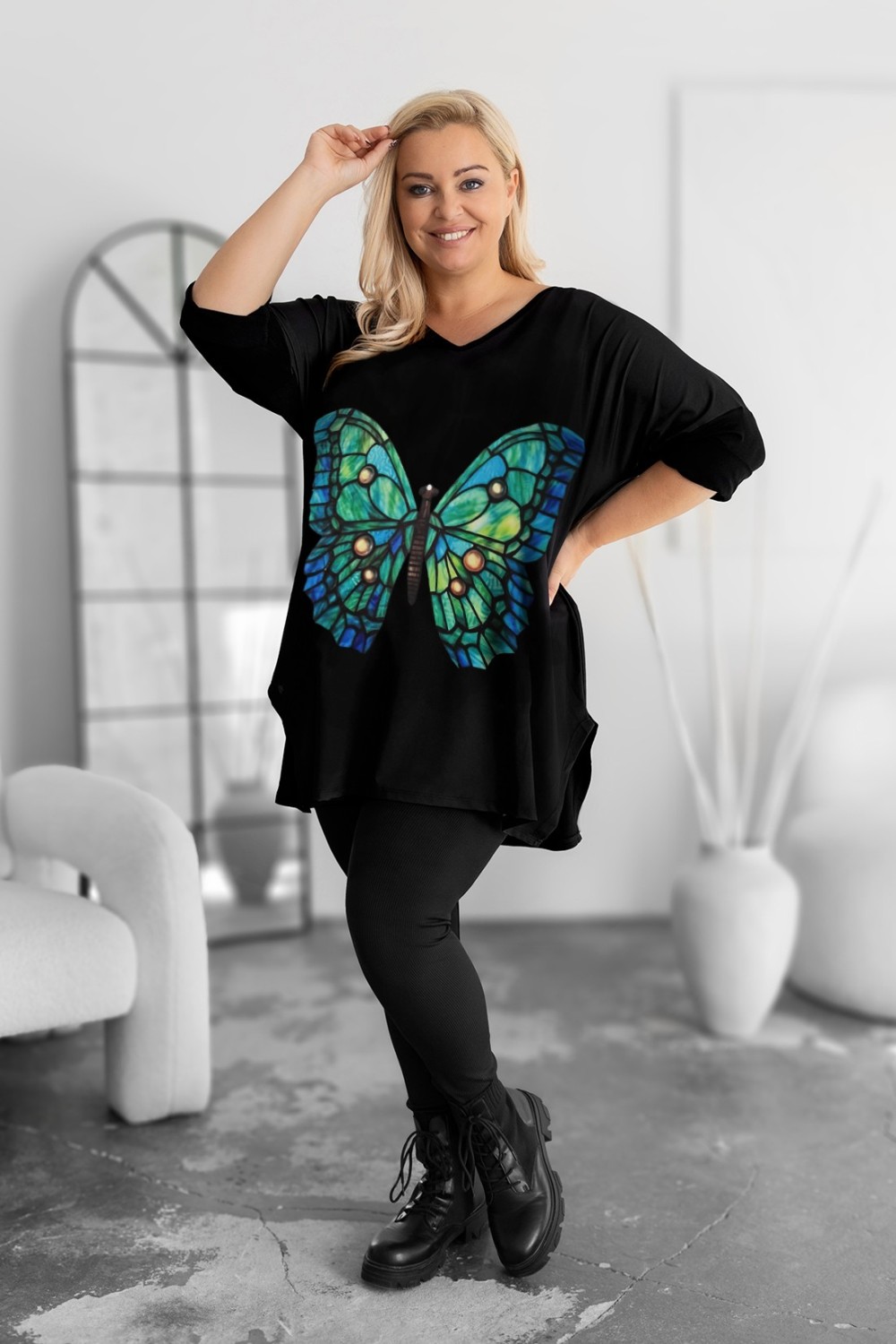 Tunika plus size dekolt w serek V wzór duży witrażowy motyl rękaw 3/4 Weenie