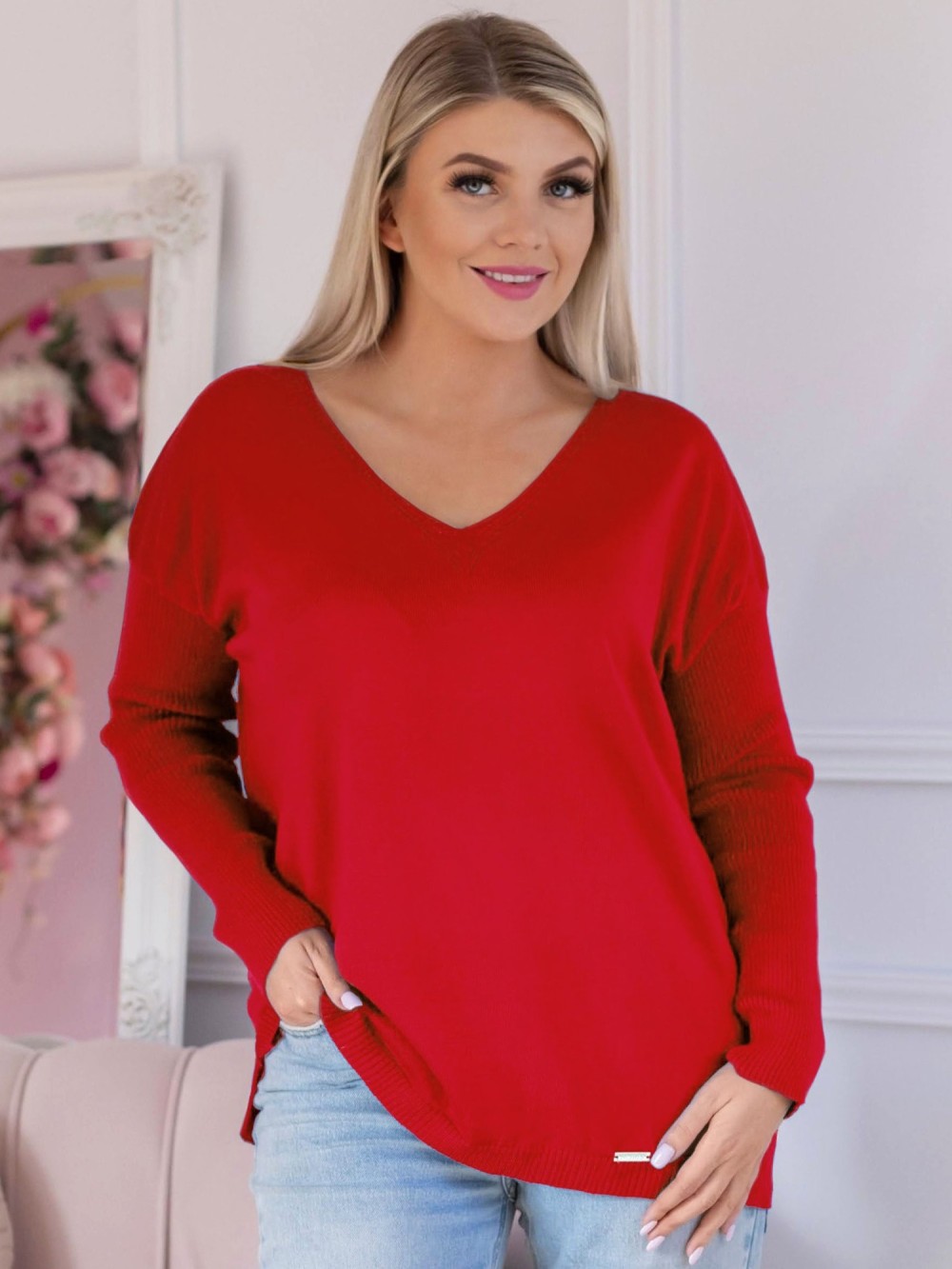 Lekki sweterek plus size GEMA w kolorze czerwonym z delikatnie dłuższym tyłem. Dekolt sweterka jest w serek, a jego długie rękawy są zdobione prążkami. Dół zdobi subtelna naszywka w srebrnym kolorze, co stanowi charakterystyczny element tego modelu. Sweter GEMA to gwarancja komfortu i wygody noszenia - niezależnie od okazji. Sprawdzi się zarówno do spodni, jak i spódnic. W chłodny dzień możesz uzupełnić stylizację kamizelką lub kataną.