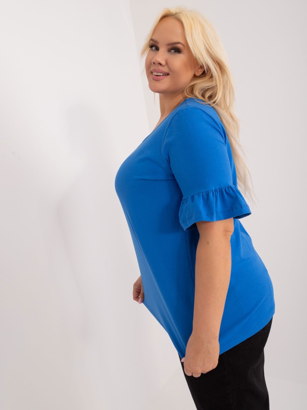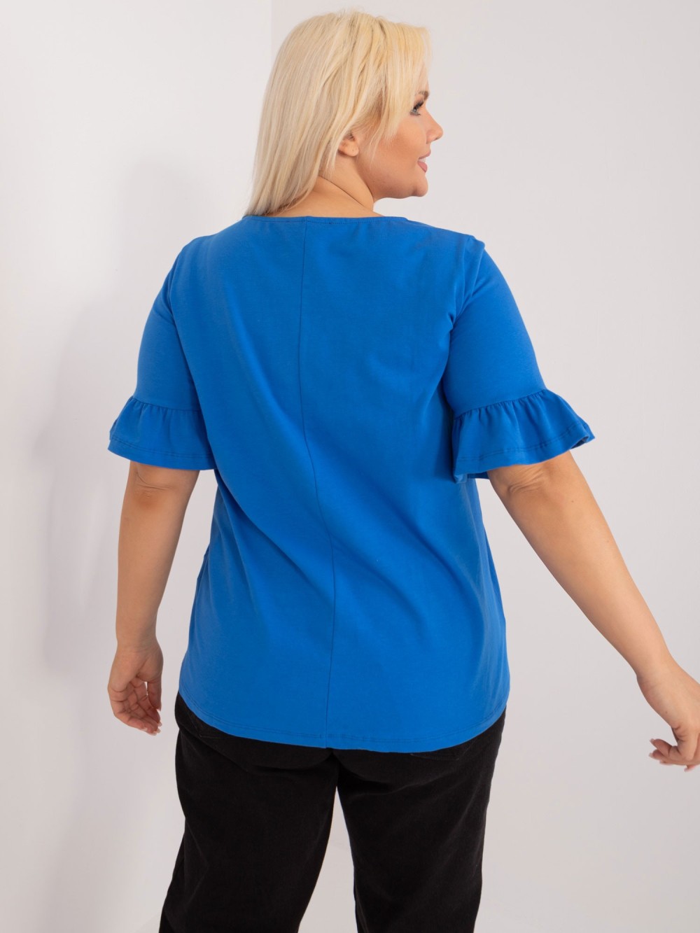 Niebieska bluzka damska plus size. Piękna bluzka z krótkim rękawem zakończonym falbanką. Bluzka wykonana ze świetnej jakości materiału sprawdzi się zarówno w codziennym jak i imprezowym looku. Wybierz do niej eleganckie spodnie lub dresową spódnicę.