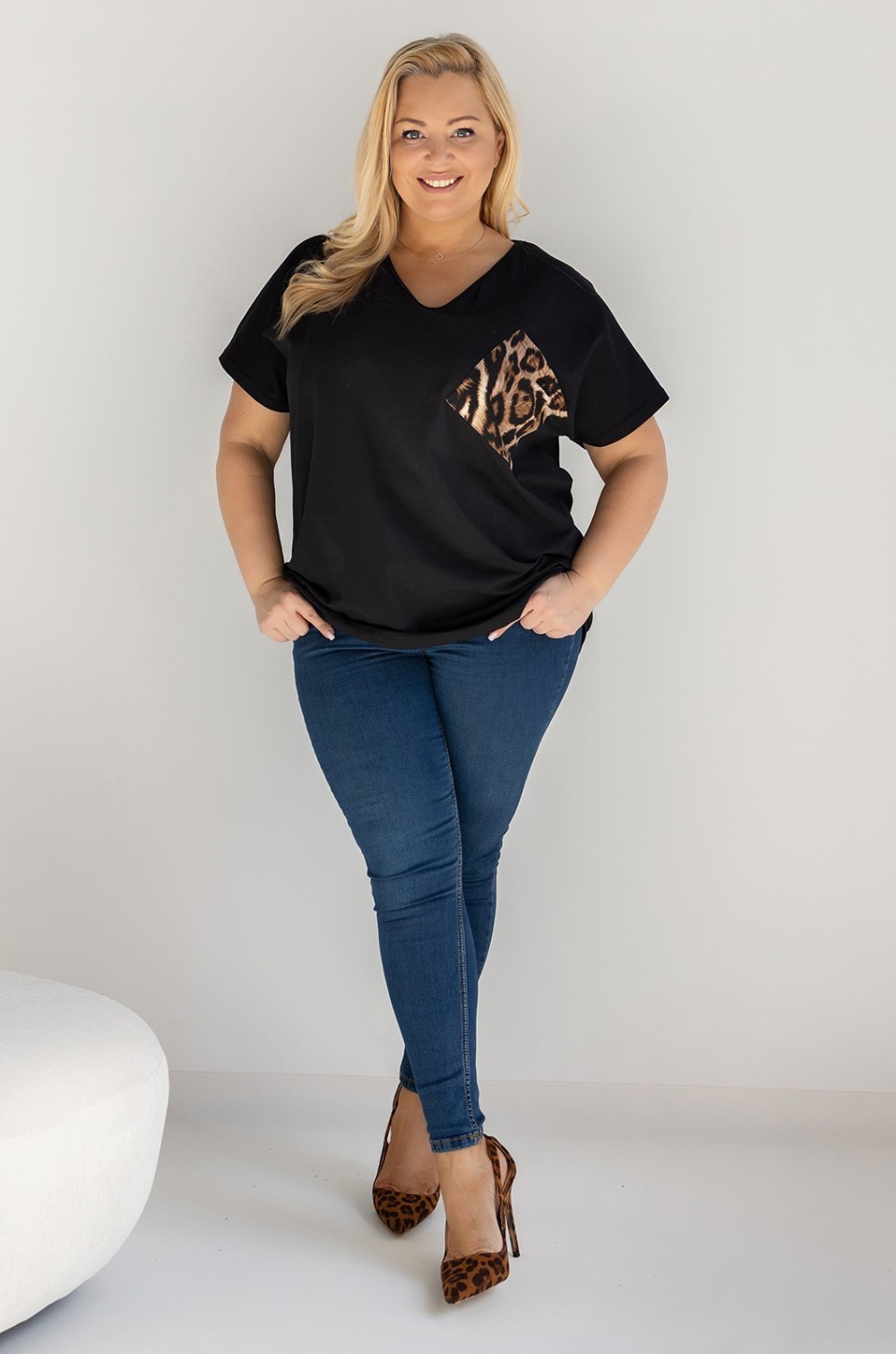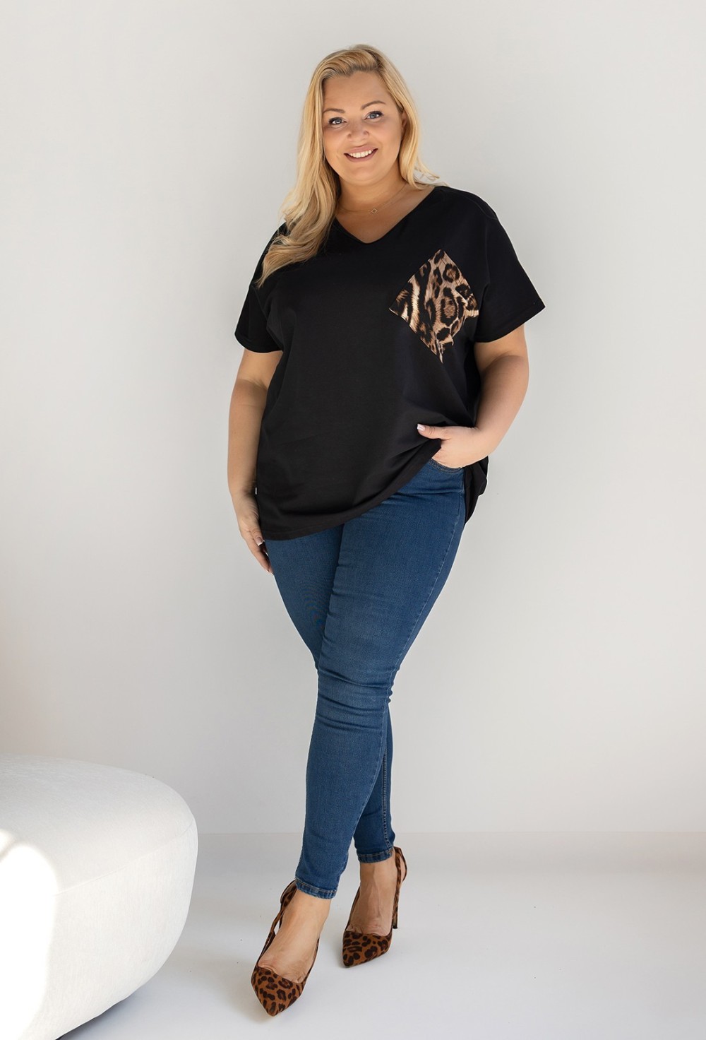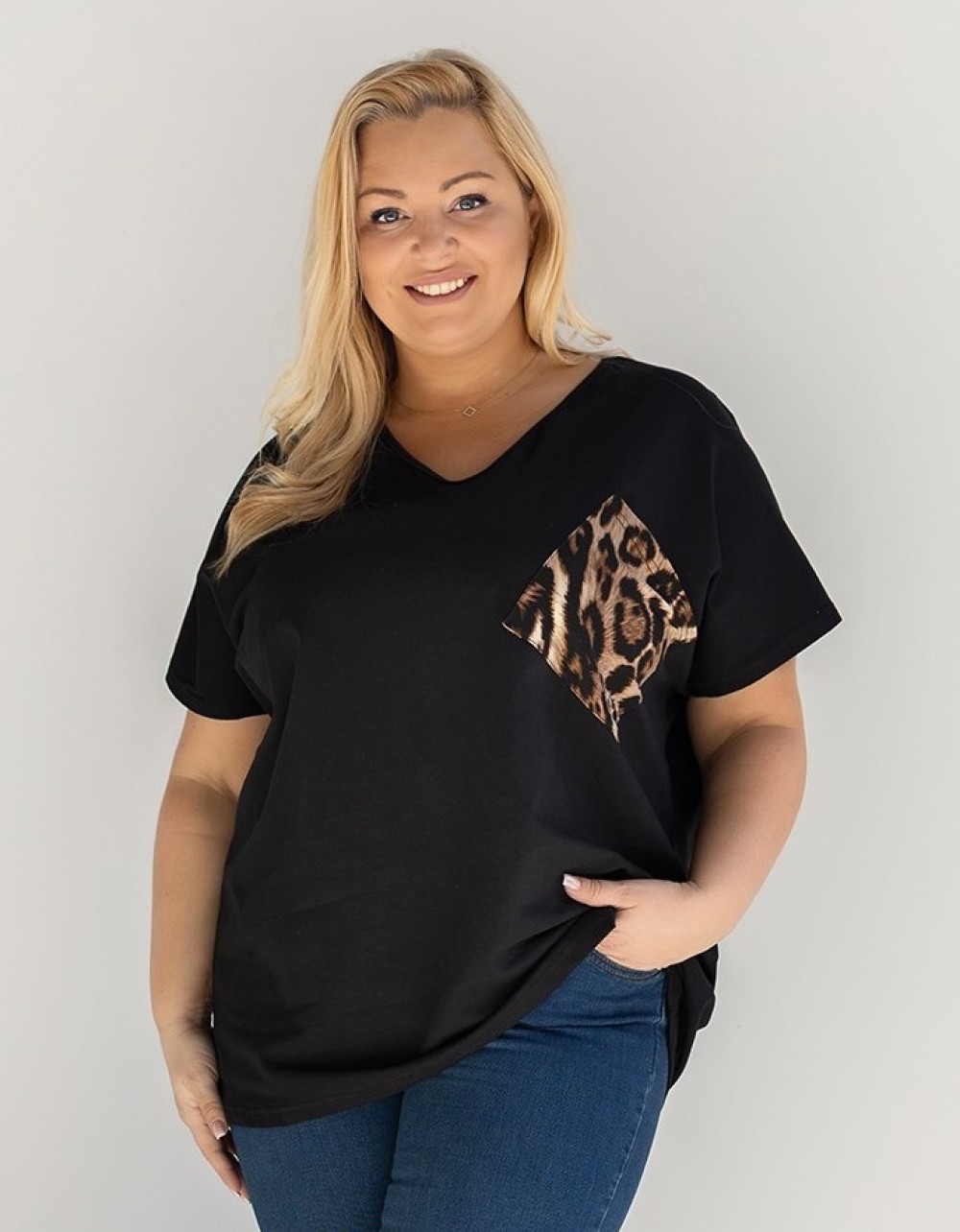 T-shirt damski plus size w kolorze czarnym dekolt w serek V-neck panterka kieszeń DESA