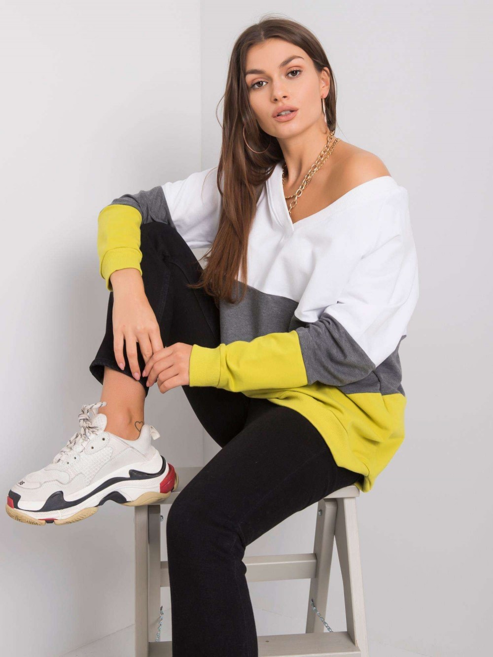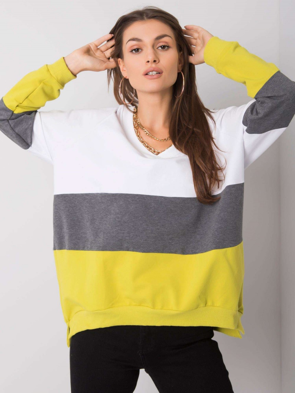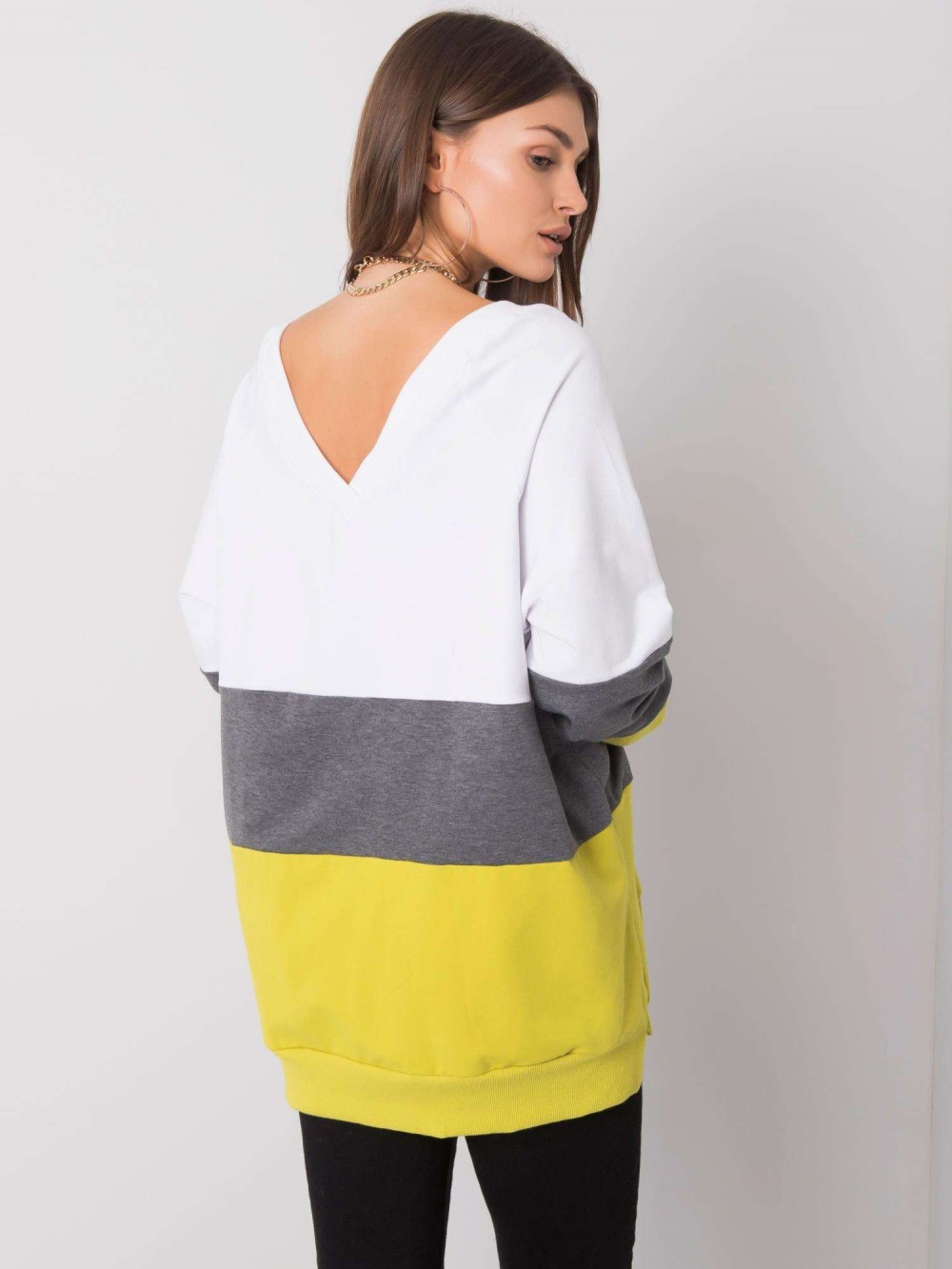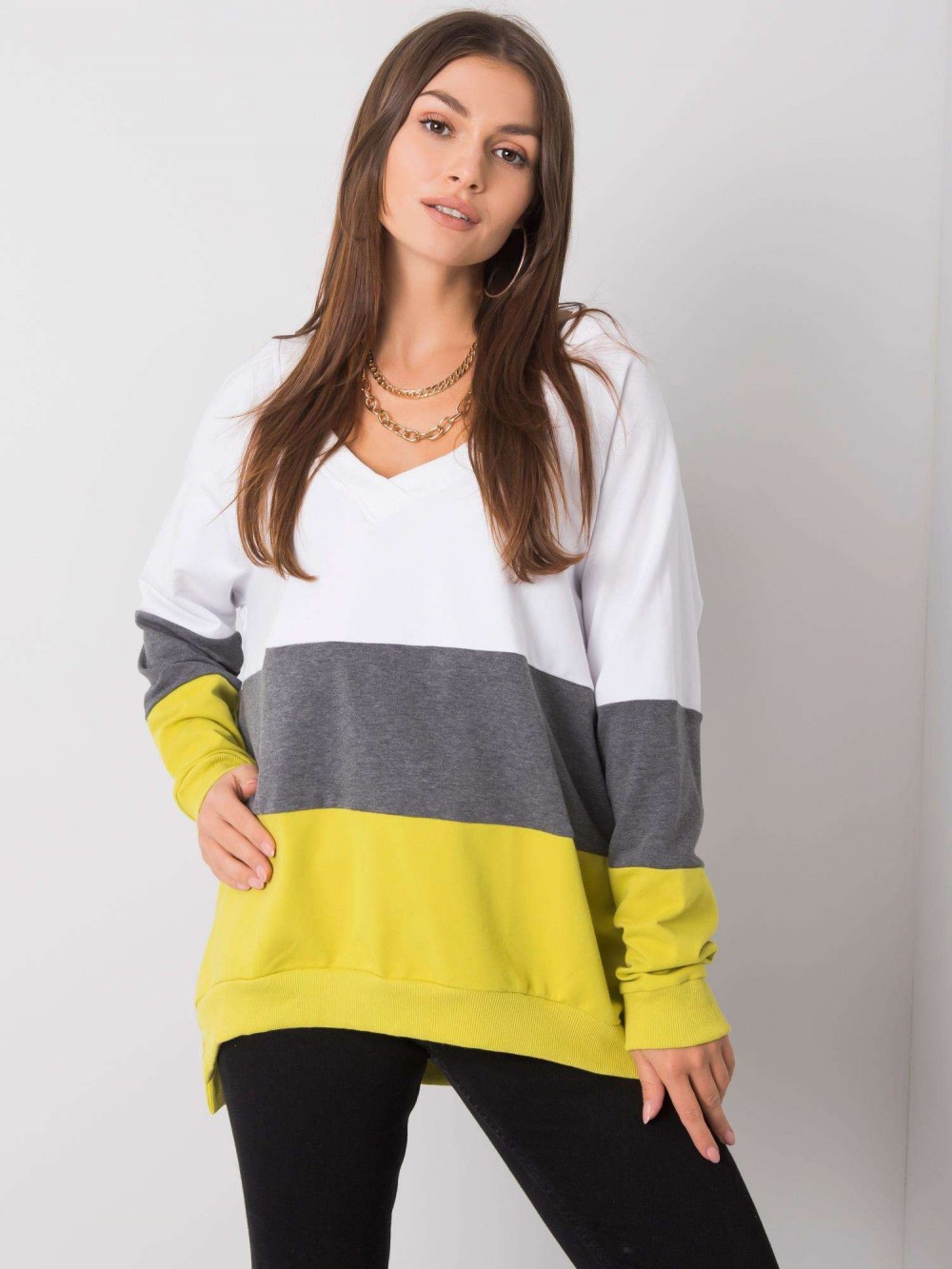 Luźna bluza damska z dekoltem w serek. Bluza wykonana ze świetnej jakości materiału, który doskonale układa się na każdej sylwetce. Bluza oversize sprawdzi się w codziennej stylizacji w połączeniu z jeansami, legginsami czy spódnicą. Nasze bluzy to nie tylko komfort noszenia ale przede wszystkim styl i trendy! Dekolt v-neck został delikatnie i estetycznie wykończony, a dół bluzy i rękawki zakończone lekkim ściągaczami.