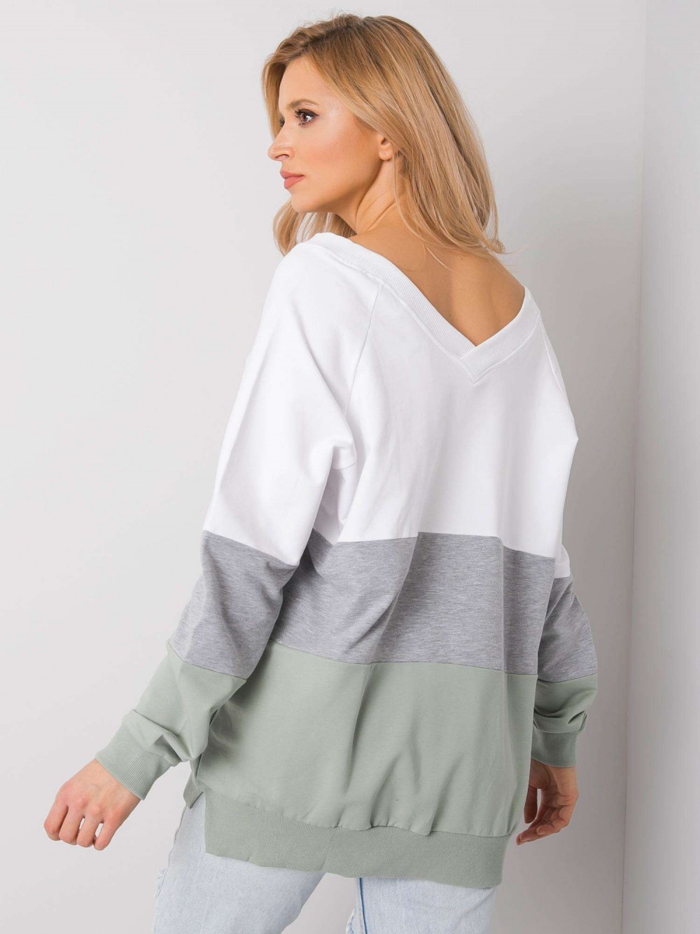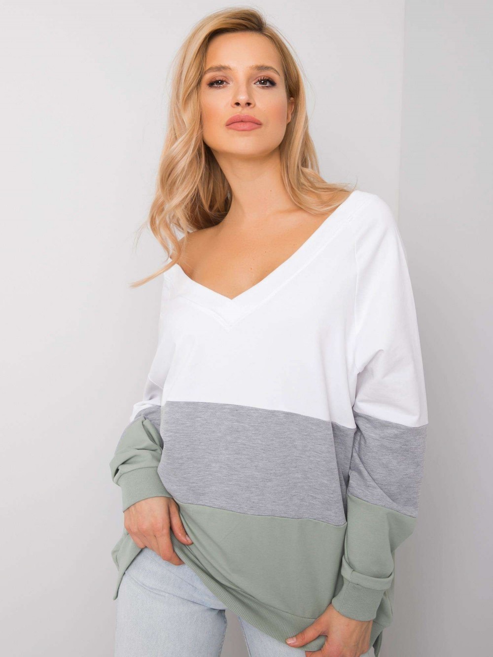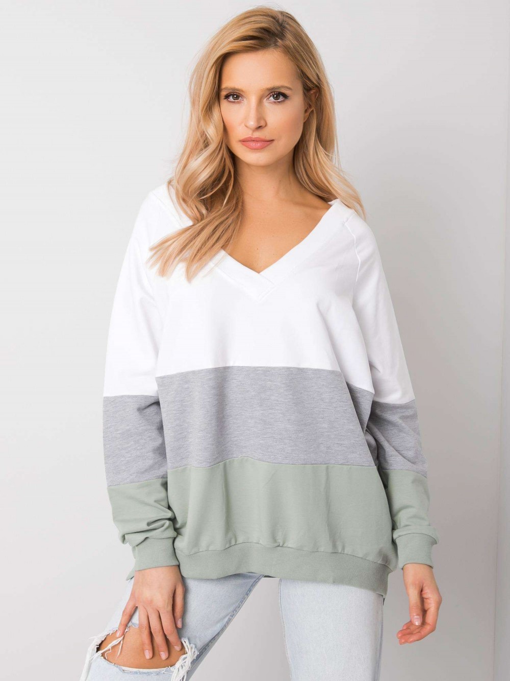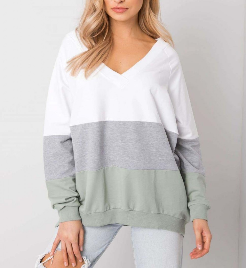 Luźna bluza damska z dekoltem w serek. Bluza wykonana ze świetnej jakości materiału, który doskonale układa się na każdej sylwetce. Bluza oversize sprawdzi się w codziennej stylizacji w połączeniu z jeansami, legginsami czy spódnicą. Nasze bluzy to nie tylko komfort noszenia ale przede wszystkim styl i trendy! Dekolt v-neck został delikatnie i estetycznie wykończony, a dół bluzy i rękawki zakończone lekkim ściągaczami.