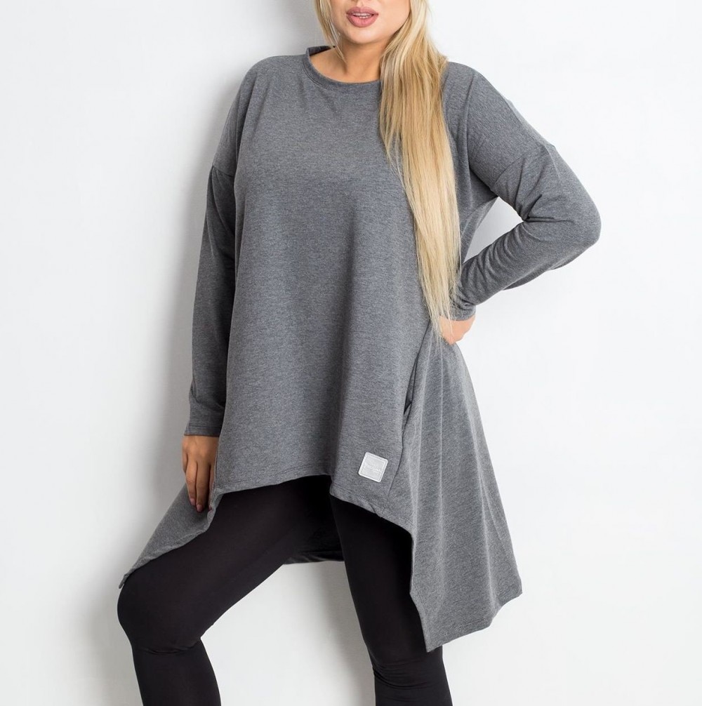 Asymetryczna tunika plus size w kolorze grafitowego melanżu z kieszeniami dłuższy tył EMILY